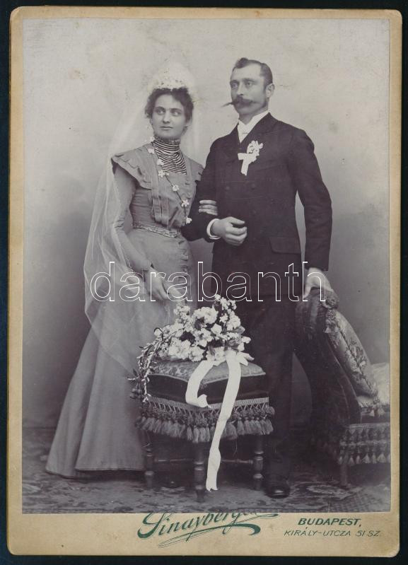 Beschreibung: cca 1910 Esküvői fotó, kabinetfotó Sinayberger Béla budapesti műterméből, hátoldalán albumba ragasztás nyomaival, 16x11,5 cm