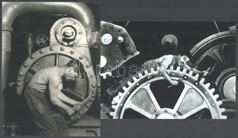 Beschreibung: cca 1921 és 1936 ,,Képi párhuzamok", Lewis Hine (1874-1940) amerikai fotográfus felvétele, + hozzáadva Charlie Chaplin Modern idÅ‘k cÃmű filmjének egy jelenetfotóját, 2 db modern nagyÃtás, jelzés nélkül, 21x15 cm és 15x21 cm