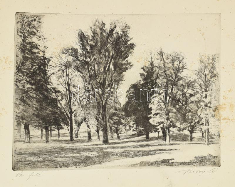 Beschreibung: Beron Gyula (1885-1971): Ősz felé. Rézkarc, papír, jelzett, kartonra kasírozva, foltos, 29,5×39 cm