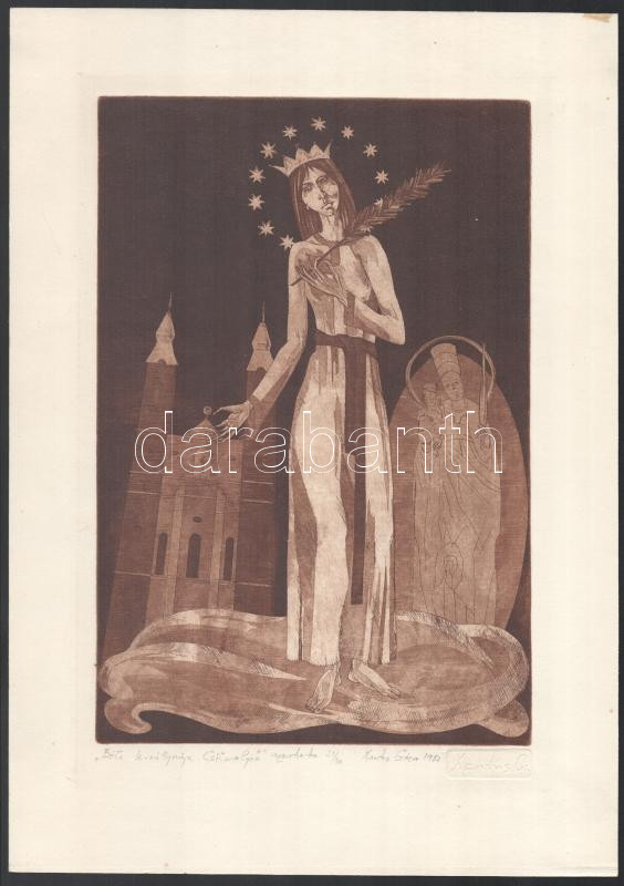 Beschreibung: Xantus Géza (1958- ): Béla királynője Csíksomlyón. Aquatinta, papír, jelzett, számozott (21/30), 29×19,5 cm