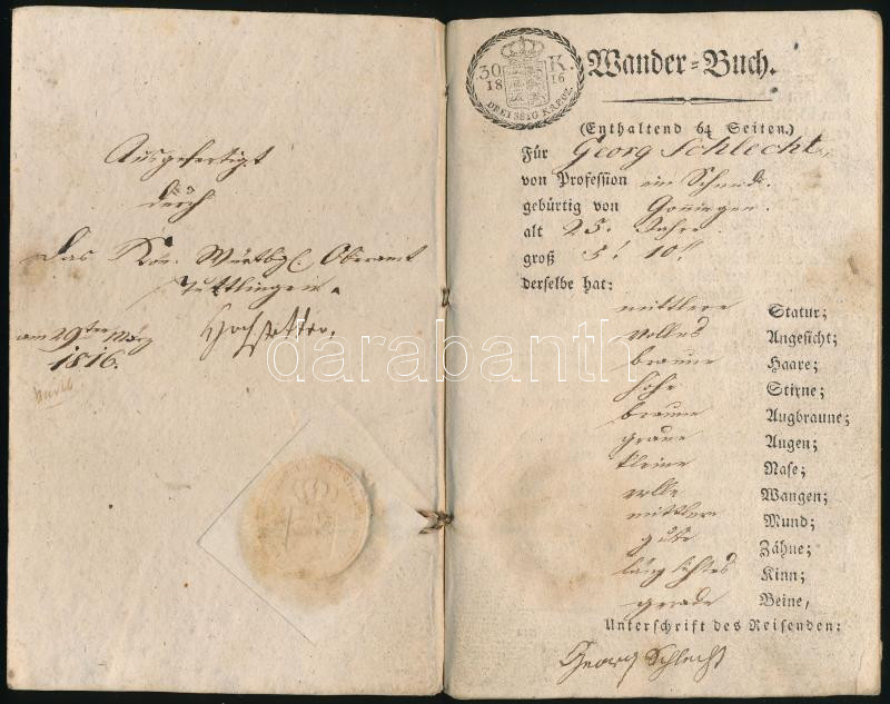 1816 Német nyelvű vándorkönyv https://www.darabanth.com/de/467-Fernauktion/467.0/Kunst-Dokumente-andere-Sammelgebiete/Dokument~2000098/1816-Nemet-nyelvu-vandorkonyv~II3157945