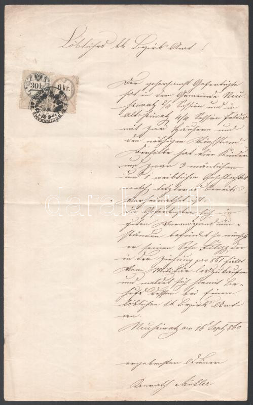 1860 Neuszivatz (Újszivác, Szivác), Vajdaság, német nyelvű hivatalos levél / kérvény, egy beírt oldal, 30+6kr okmánybélyeggel, "K. k. Bezirksamt zu Zombor" bélyegzéssel