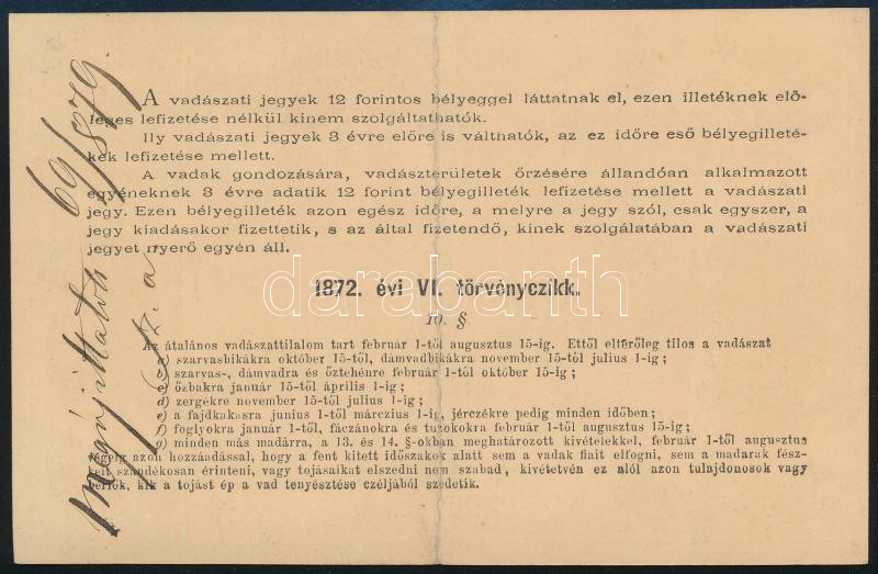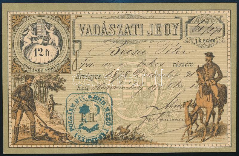 Beschreibung: 1878 Vadászati jegy Hódmezővásárhelyen kiállítva, Ábrai Károly (1830-1912), Hódmezővásárhely polgármestere autográf aláírásával, 12 Ft értékjeggyel / Hunting card