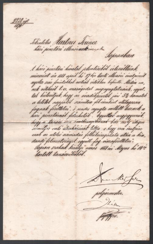 1881 Sopron, a szabad királyi város polgármestere által a házi pénztár... https://www.darabanth.com/de/467-Fernauktion/467.0/Kunst-Dokumente-andere-Sammelgebiete/Dokument~2000098/1881-Sopron-a-szabad-kiralyi-varos-polgarmestere-altal-a-hazi-penztari-ellenornek-cimzett-level-~II3157929