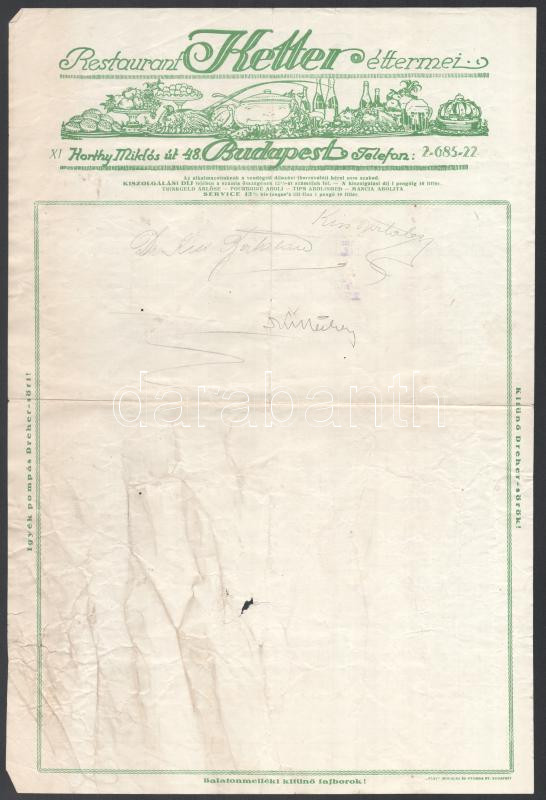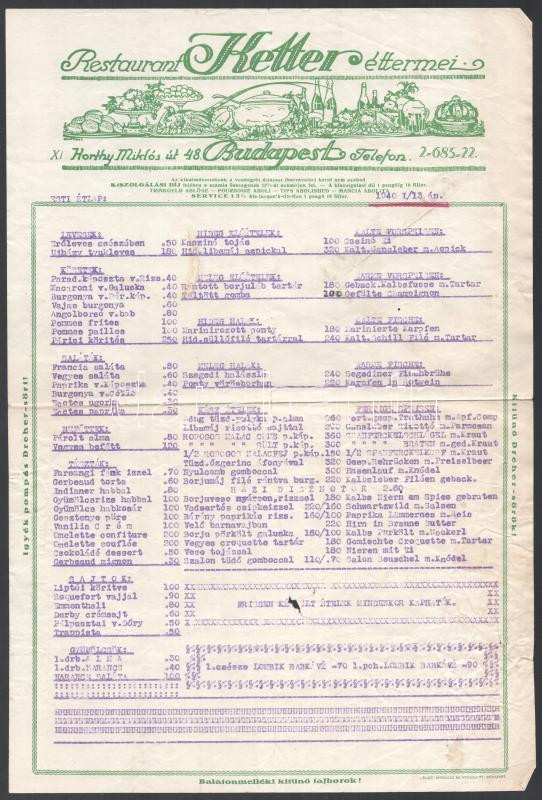 1940 Bp. XI. Horthy Miklós út 48., Ketter Éttermei étlap https://www.darabanth.com/de/467-Fernauktion/467.0/Kunst-Dokumente-andere-Sammelgebiete/Dokument~2000098/1940-Bp-XI-Horthy-Miklos-ut-48-Ketter-Ettermei-etlap~II3155434