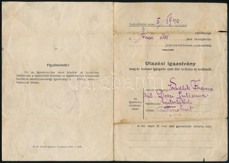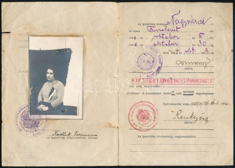 1940 Utazási igazolvány magyar katonai igazgatás alatt álló területre ... https://www.darabanth.com/de/467-Fernauktion/467.0/Kunst-Dokumente-andere-Sammelgebiete/Dokument~2000098/1940-Utazasi-igazolvany-magyar-katonai-igazgatas-alatt-allo-teruletre-es-teruletrol-fenykeppel~II3158004