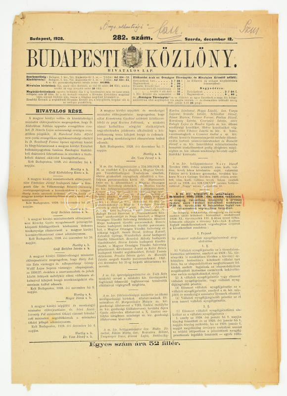 1928 Budapesti Közlöny 282. sz., 1928. dec. 12., 10 p. https://www.darabanth.com/de/467-Fernauktion/467.0/Kunst-Dokumente-andere-Sammelgebiete/Drucksachen~2000102/1928-Budapesti-Kozlony-282-sz-1928-dec-12-10-p~II3097546