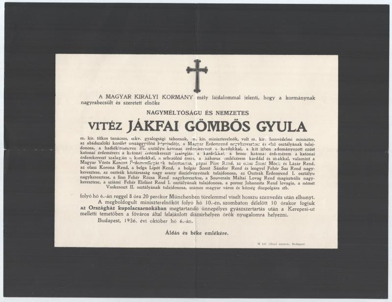 1936 vitéz jákfai Gömbös Gyula (1886-1936) miniszterelnök halotti érte... https://www.darabanth.com/de/467-Fernauktion/467.0/Kunst-Dokumente-andere-Sammelgebiete/Drucksachen~2000102/1936-vitez-jakfai-Gombos-Gyula-1886-1936-miniszterelnok-halotti-ertesitoje~II3153517