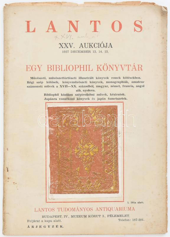 1937 Lantos antikvárium XXV. aukció katalógus 60p. Ünnepi köszöntővel,... https://www.darabanth.com/de/467-Fernauktion/467.0/Kunst-Dokumente-andere-Sammelgebiete/Drucksachen~2000102/1937-Lantos-antikvarium-XXV-aukcio-katalogus-60p-Unnepi-koszontovel-meghivoval-ceruzaval-beirt~II3152519