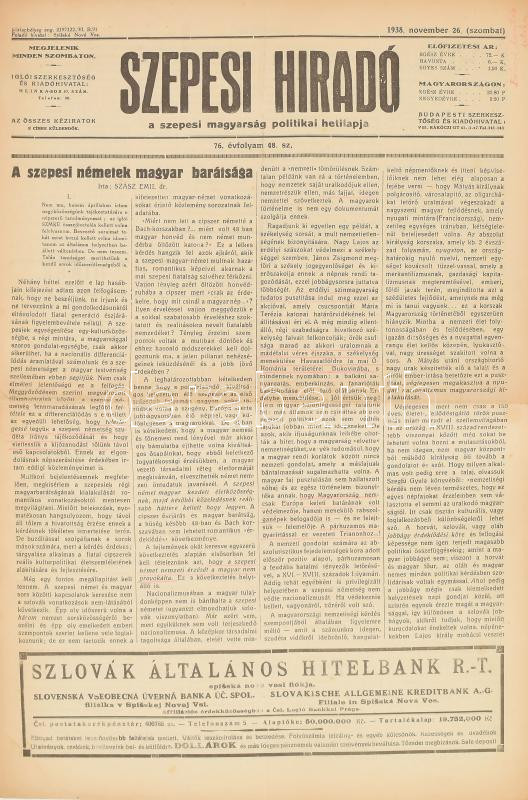 1938 Szepesi Hiradó, a szepesi (Felvidék) magyarság politikai hetilapj... https://www.darabanth.com/de/467-Fernauktion/467.0/Kunst-Dokumente-andere-Sammelgebiete/Drucksachen~2000102/1938-Szepesi-Hirado-a-szepesi-Felvidek-magyarsag-politikai-hetilapja-76-evf-48-sz-1938~II3157436