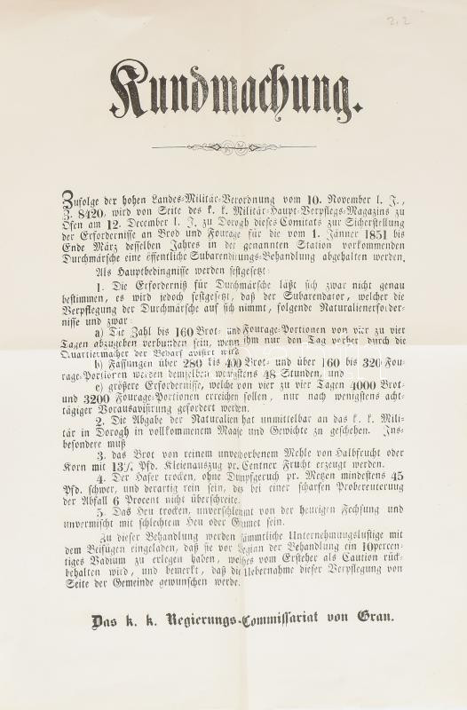 cca 1840 Esztergom, német nyelvű hirdetmény kenyér- és lisztmennyiségg... https://www.darabanth.com/de/467-Fernauktion/467.0/Kunst-Dokumente-andere-Sammelgebiete/Drucksachen~2000102/cca-1840-Esztergom-nemet-nyelvu-hirdetmeny-kenyer-es-lisztmennyiseggel-kapcsolatban~II3158788