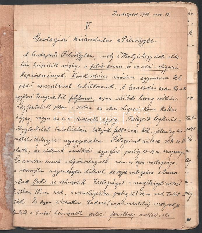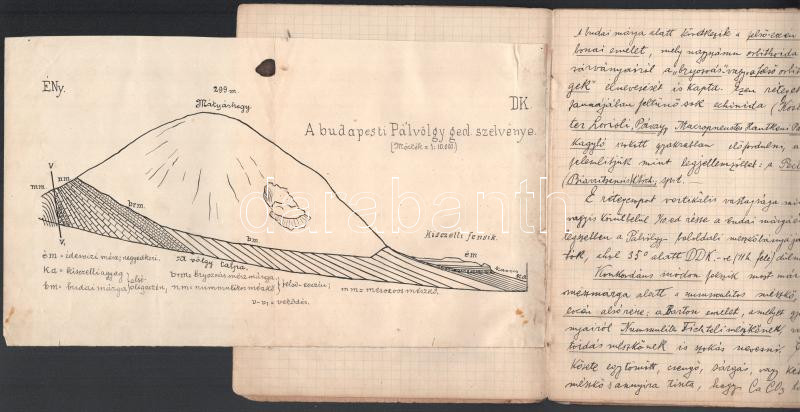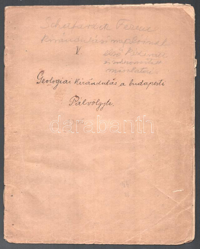 1906 Bp., Geológiai kirándulás a Pálvölgybe, Schafarzik Ferenc (1854-1927) geológus, műegyetemi tanár, az MTA tagjának kézirata. 10 beírt oldal + 1 kézzel rajzolt, kihajtható melléklet (A budapesti Pálvölgy geol. szelvénye, 1 : 10.000). Papírkötésben, korának megfelelő állapotban.