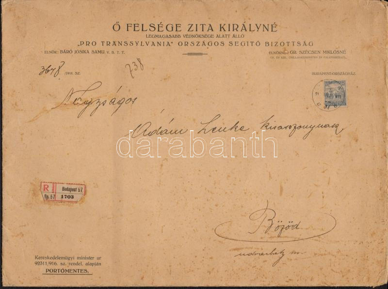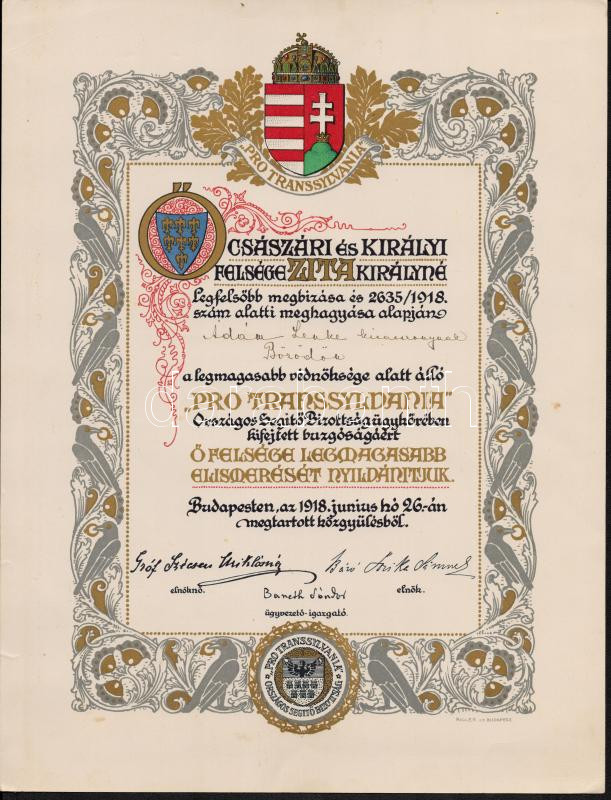 1918 Pro Transsylvania Országos Segítő Bizottság Zita királyné őfelsége legmagasabb elismerése, díszes oklevél, Rigler Rt., eredeti borítékjában, 33x25 cm