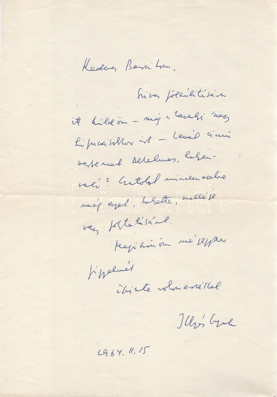 Illyés Gyula (1902-1983) költÅ‘, Ãró, drámaÃró levele FenyÅ‘ István (1929-2017) kritikushoz, a Szépirodalmi Könyvkiadó felelÅ‘s szerkesztÅ‘jéhez. Kelt: Budapest, 1964. II. 15. Egyetlen, kézzel, tintával beÃrt levél, mérete: 287x202 mm. Szövege: ,,Kedves Barátom, SzÃves fölszólÃtására itt küldöm - még a tavalyi nagy hófúvásokkor Ãrt - Levél cÃmű versemet. Alkalmas, helyénvaló? Csatolok minden esetre még egyet, helyette, melléje vagy folytatásának. Megköszönve mégegyszer figyelmét, Å‘szinte rokonérzéssel, Illyés Gyula.'' Jó állapotú levél, középen régi hajtás nyomával, eredeti borÃtékban, Illyés Gyula által saját kezűleg megcÃmezve: ,,FenyÅ‘ István, Szépirodalmi Kiadó, Budapest, VII. Lenin krt. 9-11.'' A borÃték jobb felsÅ‘ sarkából a bélyeg kivágva.