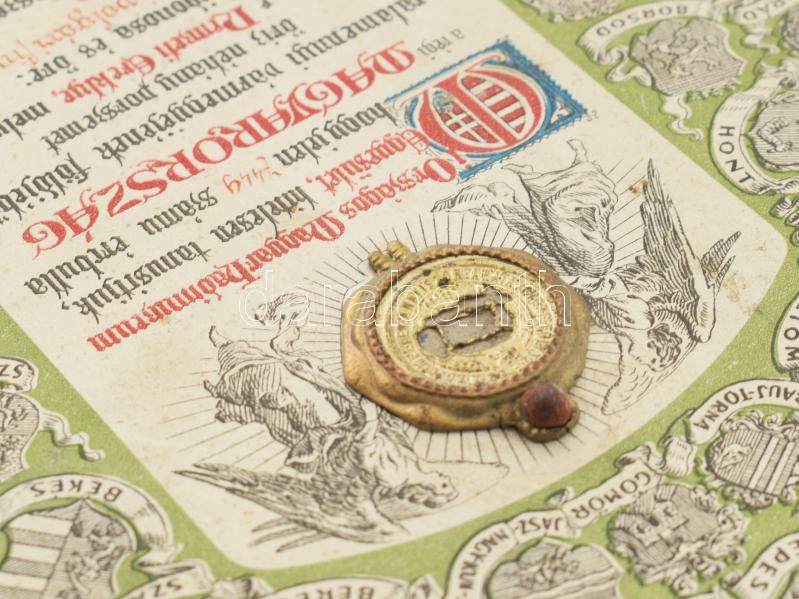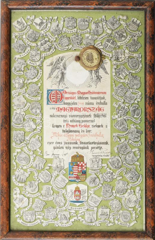 cca 1920-1930 Az Országos Magyar Hadimúzeum Egyesület által kiadott "Nemzeti Ereklye", Nagy-Magyarország vármegyéinek földjéből származó porszemeket tartalmazó "Ércbulla", sorszámozott, névre szóló (M. kir. állami polgári fiúiskola, Kőszeg). Fakeretben, 21,5x14 cm