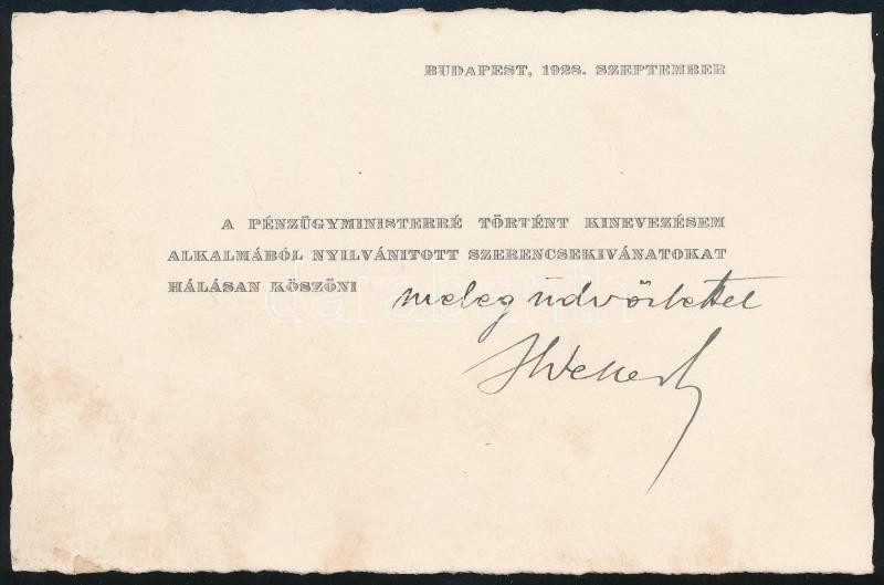 Beschreibung: 1928 Bp., Wekerle Sándor (1878-1963) pénzügyminiszter aláírása köszönőkártyán