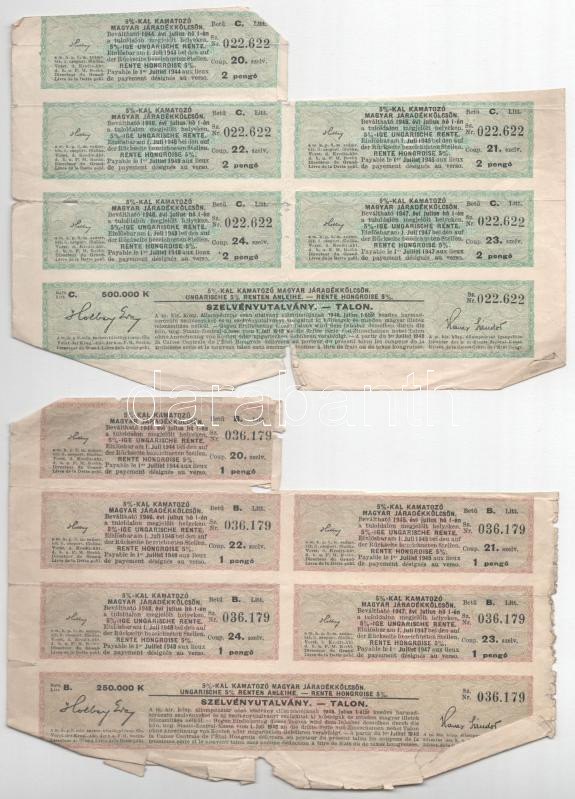 Beschreibung: Budapest 1925. "Magyar Királyság 5%-kal kamatozó Járadékkölcsön Államadóssági Kötvény" 250.000K-ról és 500.000K-ról (2xklf) szelvényekkel T:VG szakadás