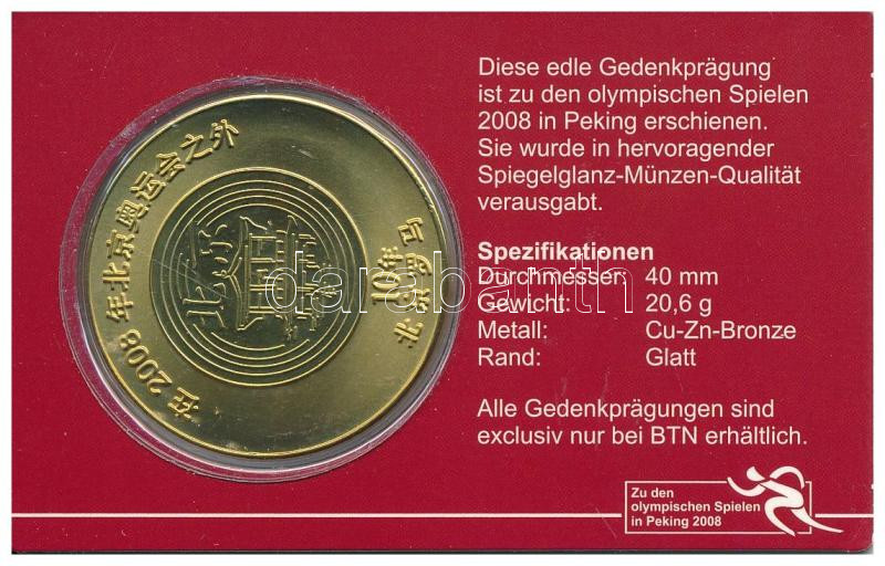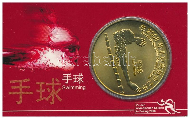 Kína 2008. "XXIX. Nyári Olimpia, Peking - Úszás" kétoldalas Cu-Zn-bronz emlékérem eredeti, "2008-as Pekingi Nyári Olimpiai Játékok" karton díszlapon (40mm) T:P