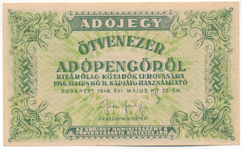 1946. 50.000AP sorszám nélkül, nem vízjeles papíron, a hátoldali szövegben számos helyesírási hibával (lemaradt / jel, hiányzó ékezetek) T:AU apró folt