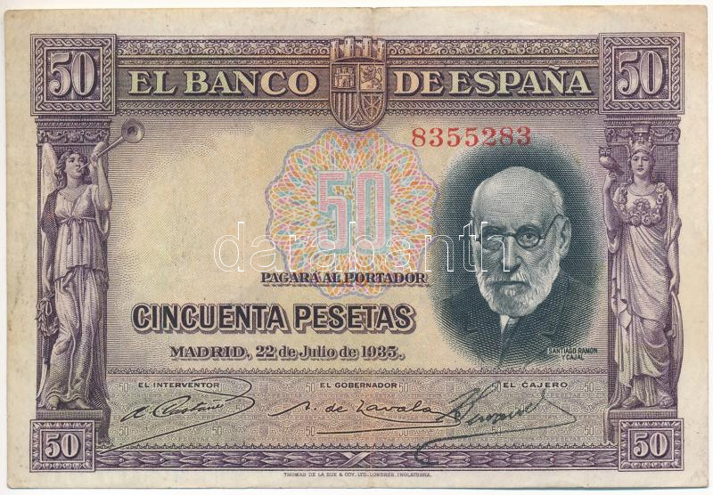 Spain 1935. 50 Pesetas C:F str... https://www.darabanth.com/de/467-Fernauktion/467.0/Numismatik/Weltweit-Banknoten~1500015/Spanyolorszag-1935-50P-T-F-eros-papirSpain-1935-50-Pesetas-C-F-strong-paperKrause-P2388~II3151138