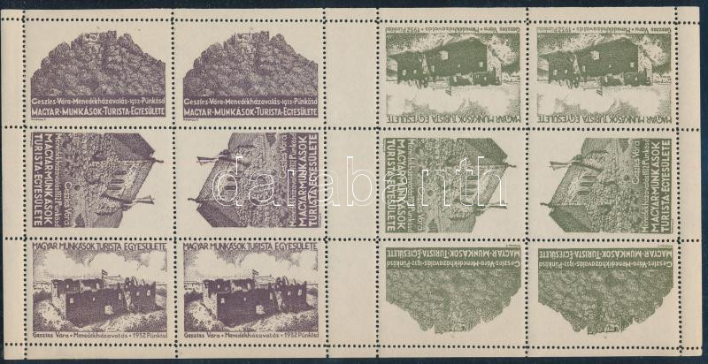 Beschreibung: 1932 Magyar Munkások Turista Egyesülete - Gesztes vára levélzáró ív fordított állású párokkal, ívközéprésszel / label complete sheet