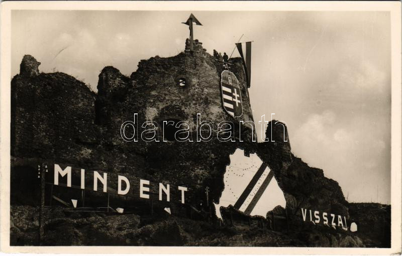 1939 Fülek, Filakovo; várrom "Mindent vissza" irredenta felirattal, Nagymagyarország és magyar zászló, címer. Fenyves Andor kiadása / castle ruins with irredenta motive, Hungarian flag and coat of arms (EK)