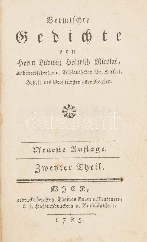 [Ludwig Heinrich von Nicolay (1737-1820)] Ludwig Heinrich Nicolai: Vermischte Gedichte. Zweyter Theil. Ofen [Buda], 1785, Joh. Thomas Edler von Trattern, 2+277 p. Neueste Auflage. Német nyelven. Korabeli egészbőr-kötésben, kopott borítóval, sérült, részben hiányos gerinccel, címkép hiánnyal, foltos borítóval.