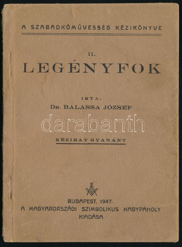 Balassa József dr.: Legényfok. II. A szabadkőművesség kézikönyve. Kézirat gyanánt. Budapest, 1947, A Magyarországi Szimbolikus Nagypáholy. Kiadói papírkötés, sérült gerinccel, kissé sérült borítóval.