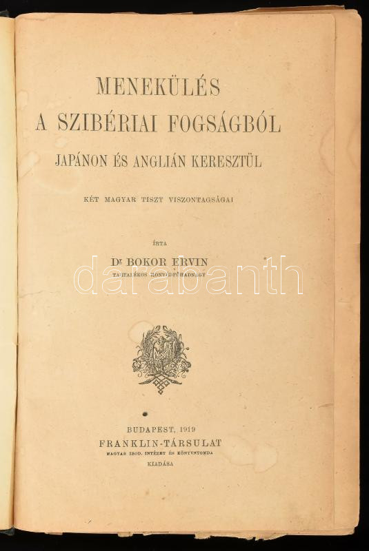 Dr. Bokor Ervin: Menekülés a szibériai fogságból. Japánon és Anglián keresztül. Két magyar tiszt viszontagságai. Bp.,1919, Franklin Társulat. félvászon-kötés, kopottas borítóval, névbejegyzéssel. 520 p.
