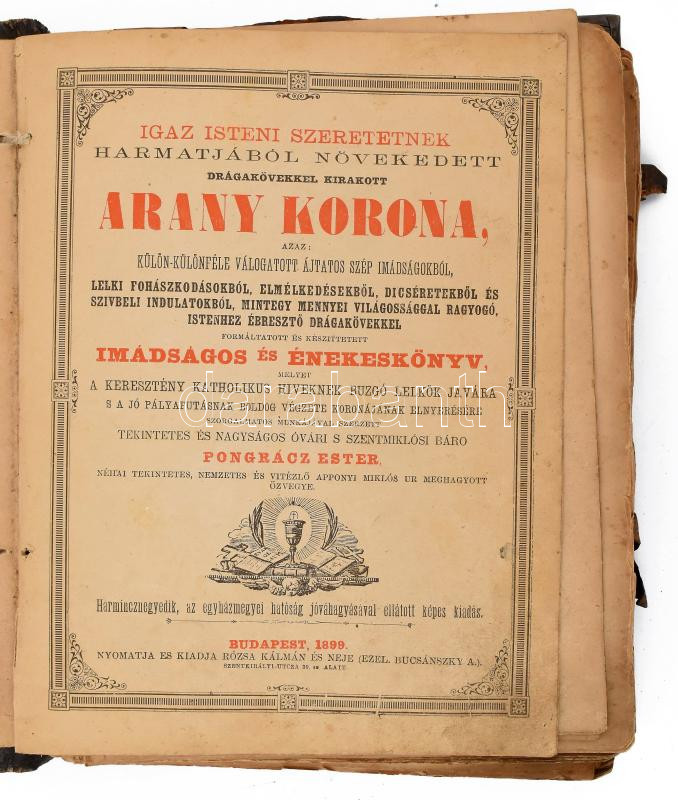 Pongrácz Eszter: Igaz isteni szeretetnek harmatjából nevelkedett drága kövekkel kirakott arany korona [...] imádságos és énekes könyv... Bp.,1899, Rózsa Kálmán és neje, 8+460+IV p. Harmincnegyedik kiadás. Korabeli aranyozott egészbőr-kötés, réz veretekkel és kapcsokkal, kopott borítóval, sérült gerinccel és kötéssel, kijáró lapokkal, benne foltos, kissé sérült lapokkal, hiányzó kapcsokkal, rossz állapotban.
