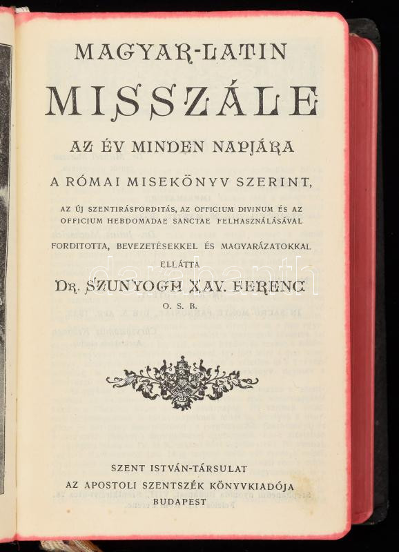 Szunyogh Xavér Ferenc: Magyar-latin misszále az év minden napjára. Ford., bevezetésekkel és magyarázatokkal ellátta - - . Bp., 1933, Szent István-Társulat, 1488 p. Kiadói egészvászon-kötés, festett lapélekkel, nagyrészt jó állapotban, a borítón a gerincnél kis sérüléssel.