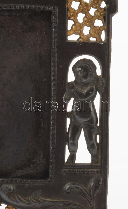 Beschreibung: Szecessziós ón képkeret, aranyozott, áttört, figurális díszítéssel 19x18 cm