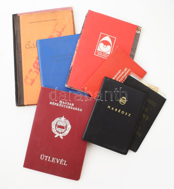 Beschreibung: 11 db vegyes igazolvány, közte MABÉOSZ tagsági igazolvány, KISZ igazolvány, piros útlevél, stb.