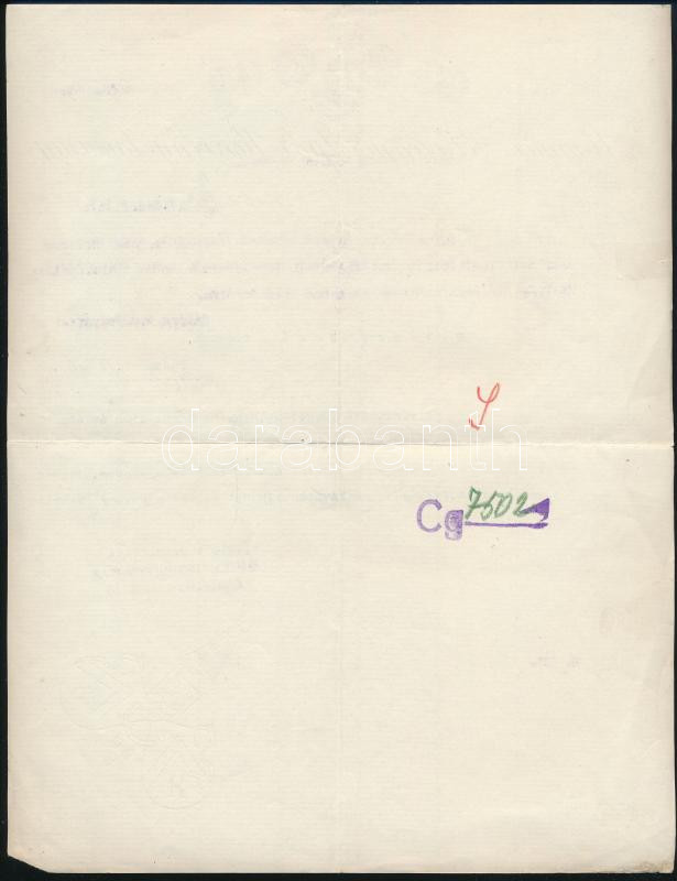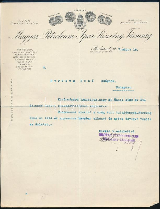 1917 A Magyar Petróleum Ipar Rt. fejléces számlán írt igazolás, hajtot... https://www.darabanth.com/de/468-Fernauktion/468.0/Kunst-Dokumente-andere-Sammelgebiete/Dokument~1000021/1917-A-Magyar-Petroleum-Ipar-Rt-fejleces-szamlan-irt-igazolas-hajtott~II3161621