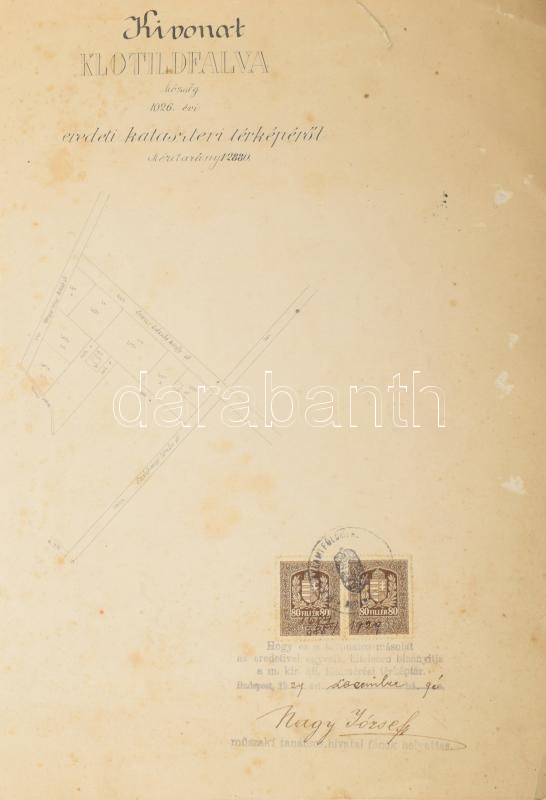 1926 Klotildfalva (Piliscsaba) telekkönyvi kivonat, szakadással https://www.darabanth.com/de/468-Fernauktion/468.0/Kunst-Dokumente-andere-Sammelgebiete/Dokument~1000021/1926-Klotildfalva-Piliscsaba-telekkonyvi-kivonat-szakadassal~II3166085