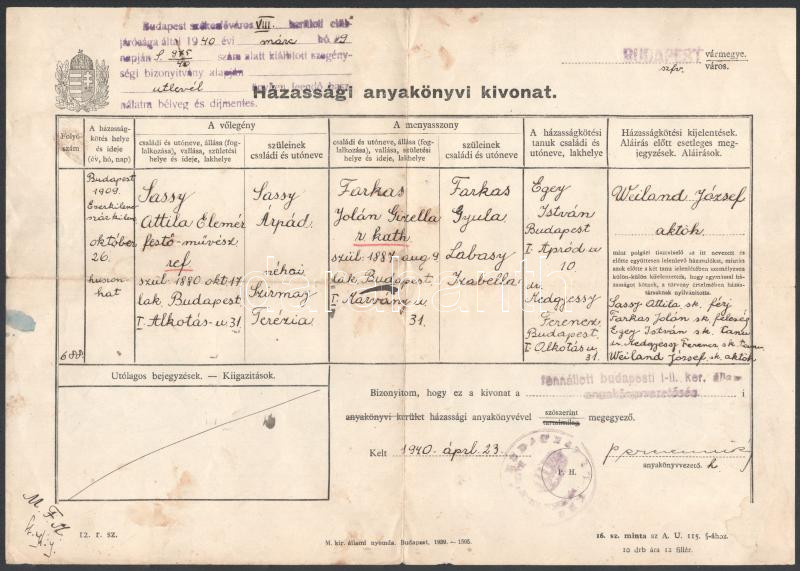 1940 Sassy Attila (1880-1967) festő házassági anyakönyvi kivonatának m... https://www.darabanth.com/de/468-Fernauktion/468.0/Kunst-Dokumente-andere-Sammelgebiete/Dokument~1000021/1940-Sassy-Attila-1880-1967-festo-hazassagi-anyakonyvi-kivonatanak-masolata~II3166037