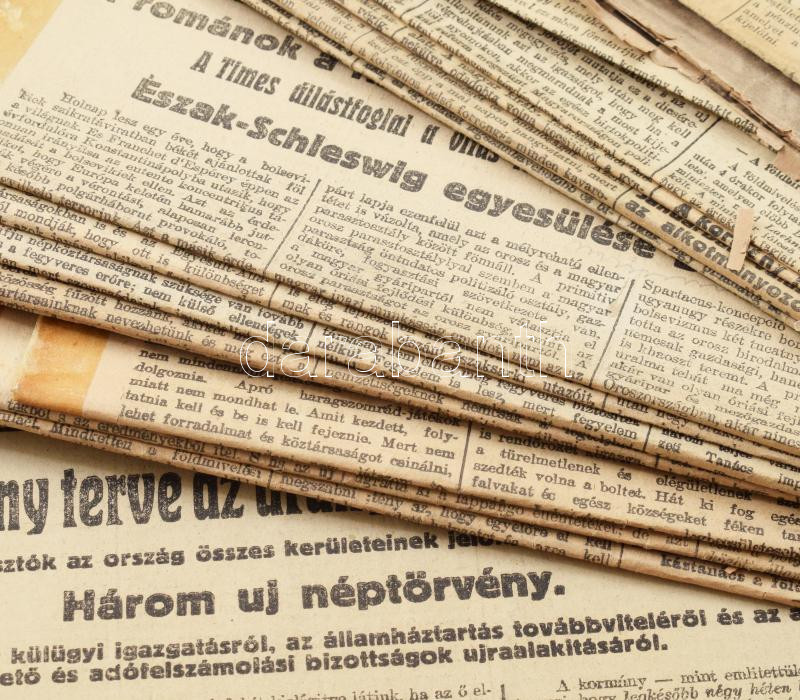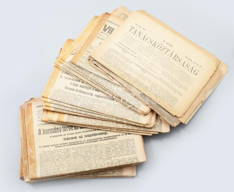 1918-1919 Vegyes, 1918-as és 1919-es újsággyűjtemény tétel: 1918 Pesti Hírlap számai: 1918. nov., 21-. dec.31., 273-279, 281, 284-285, 291-302, 304-306 számok, összesen 25 db.; 1918-1919 Az Erő. II. évf. 4-5. szám. 1918-1919. jan. Főszerk.: Ravasz Árpád. Szerk.: Deme László, 65-88 p.; 1919 Világszabadság. 1919. aug. 3., XVII. évf. 109. szám, 6 p. ; 1919 Az Est. Politikai napilap. X. évf. 105. sz. 1919. máj. 6., hiányos, 1-2 p.; 1919 Az Érdekes Ujság. 1919. VII. évf. 13. sz. [1919. ápril. 3.], rossz állapotban, 30 p.; 1919 Hivatalos Közlöny. 108. szám, 1919. aug. 2., 1 sztl. lev.; 1919. Tanácsköztársaság. 2., 94., 106. számok, 1919. március 27., jul. 17., 31., 3 p.; 2 p.; 3 p.; Összesem 33 db újság. Változó állapotban, közte sok a gerincén javított, közte több sérült, és hiányos is. Benne izgalmas, korabeli hírekkel.