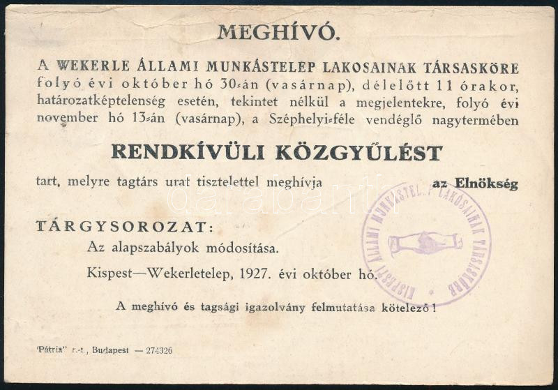 1927 Kispest-Wekerletelep, meghívó a Wekerle Állami Munkástelep közgyű... https://www.darabanth.com/de/468-Fernauktion/468.0/Kunst-Dokumente-andere-Sammelgebiete/Drucksachen~2000104/1927-Kispest-Wekerletelep-meghivo-a-Wekerle-Allami-Munkastelep-kozgyulesere-a-Szephelyi-fele~II3162580