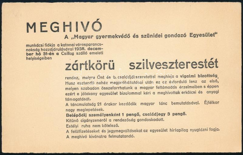 Beschreibung: 1938 Munkács, Meghívó a katonai városparancsnokság engedélyével megrendezendő zártkörű szilveszterestre, amelyet a Magyar Gyermekvédő Egyesület rendez