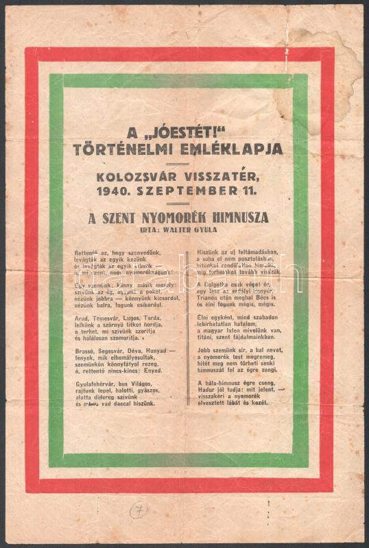 1940 A ,,Jóestét!" történelmi emléklapja. Kolozsvár visszatér, 1940. szept. 11. Walter Gyula: A szent nyomorék himnusza. Hajtva, kissé viseltes állapotban, foltos, javított, 31x20,5 cm