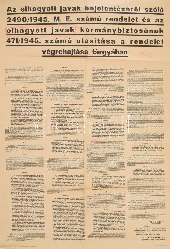 1945 Az Elhagyott Javak Kormánybiztosának nagy méretű hirdetménye 60x8... https://www.darabanth.com/de/468-Fernauktion/468.0/Kunst-Dokumente-andere-Sammelgebiete/Drucksachen~2000104/1945-Az-Elhagyott-Javak-Kormanybiztosanak-nagy-meretu-hirdetmenye-60x85-cm-Hajtva~II3159437