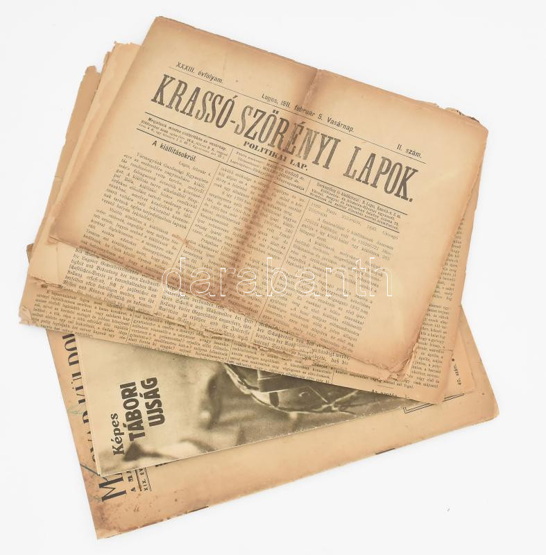 cca 1880-1944 Vegyes újság tétel, Krassó-Szörényi Lapok 1911. feb. 5., Lugoser Zeitung 1911. feb. 4., Magyar Föld 1880. júl. 29., 1938 Magyar Külpolitika XIX. évf. 11. sz., Képes Tábori Ujság 1944. szept. 30. Változó állapotban, közte sérültek is.