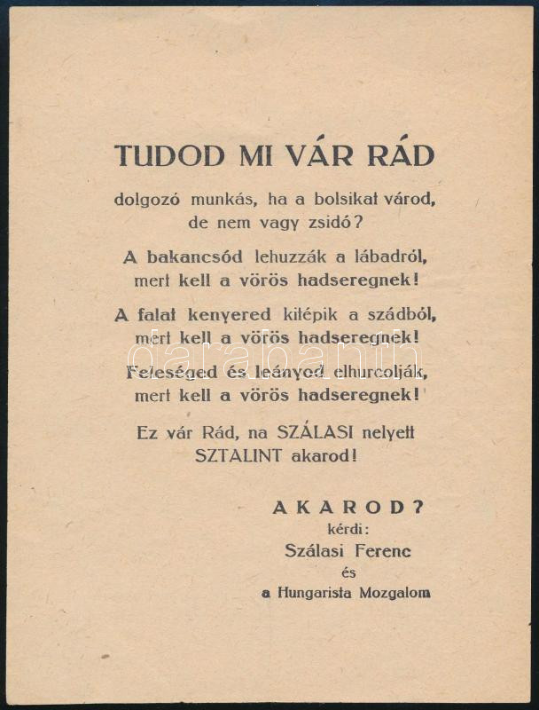 cca 1944-45 II. világháborús hungarista (nyilas) propaganda röplap, ra... https://www.darabanth.com/de/468-Fernauktion/468.0/Kunst-Dokumente-andere-Sammelgebiete/Drucksachen~2000104/cca-1944-45-II-vilaghaborus-hungarista-nyilas-propaganda-roplap-rajta-Szalasi-Ferenc-nevevel~II3162351