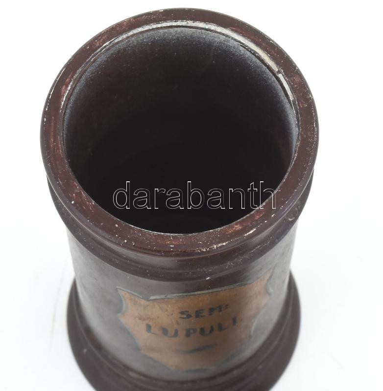 Beschreibung: Antik fából készült gyógyszeres patikai tárolóedény fedéllel, festett "Sem: Lupuli" felirattal, kopásnyomokkalm: 14 cm, d: 7,5 cm