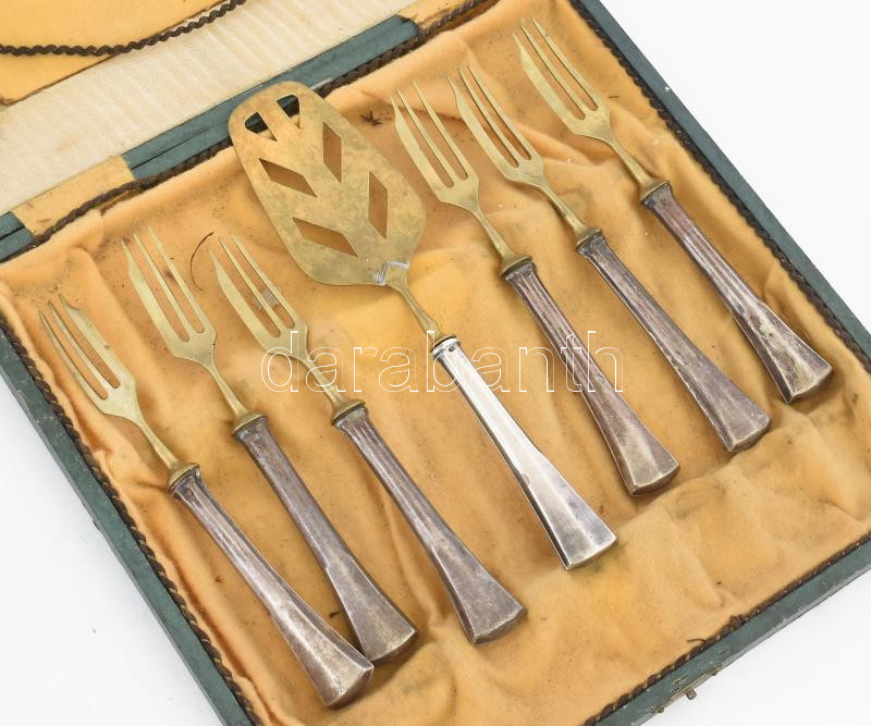 Beschreibung: Ezüstözött nyelű antik süteményes készlet, sérült díszdobozban.