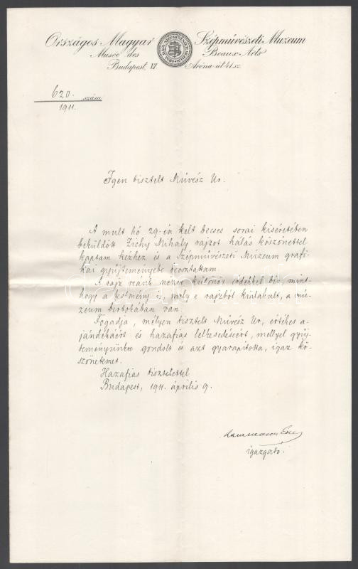 1911 Kammerer ErnÅ‘ (1856-1920) jogász, történész, országgyűlési képviselÅ‘, 1901-1914 között a Szépművészeti Múzeum elsÅ‘ igazgatója levele Kézdi-Kovács László (1864-1942) festÅ‘művész, műkritikushoz, melyben egy Zichy Mihály rajz ajándékozását köszöni meg, egy beÃrt oldal Szépművészeti Múzeum fejléces papÃrján, Kammerer ErnÅ‘ autográf aláÃrásával.