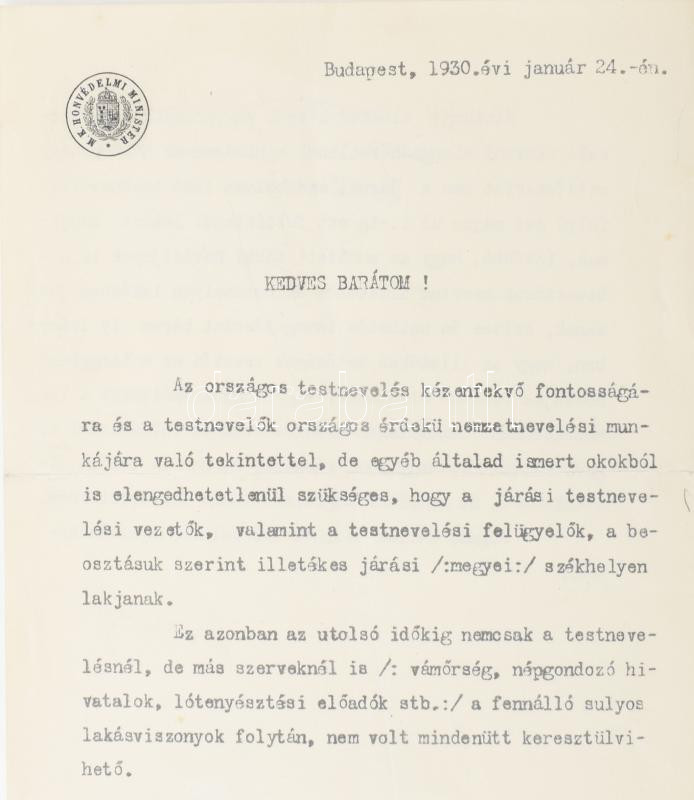 Beschreibung: 1930 Gömbös Gyula honvédelmi miniszter autográf aláírással ellátott hivatali fejléces levele
