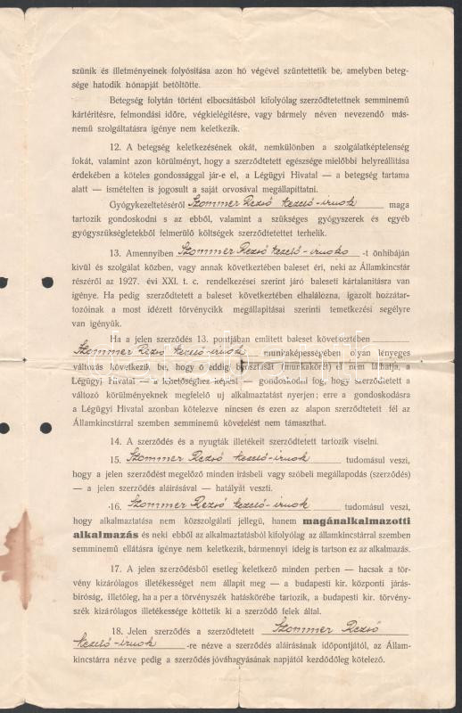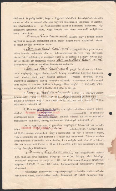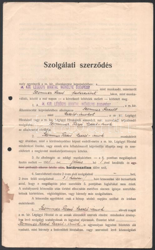 1931 Bp., szolgálati szerződés M. Kir. Légügyi Hivatal Műhelye, Bp. és alkalmazott között, M. Kir. Légügyi Hivatal főnöke autográf aláírásával, lyukasztva, kisebb szakadásokkal