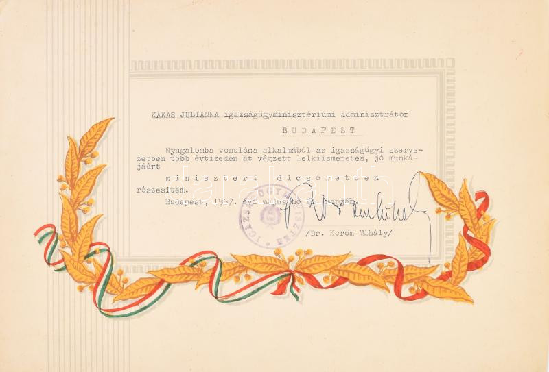 Beschreibung: 1967 Miniszteri dicséret nyugdíjba vonulás alkalmából, Dr. Korom Mihály aláírásával.