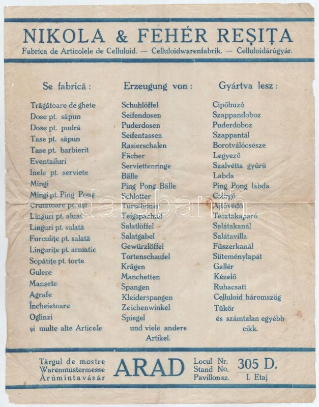 cca 1930 Nikola & Fehér Resita (Resicabánya), román, német és magyar ny. reklám csomagolópapír, alján az aradi árumintavásáron elfoglalt stand számával, apró sérülésekkel, 29,5x23 cm